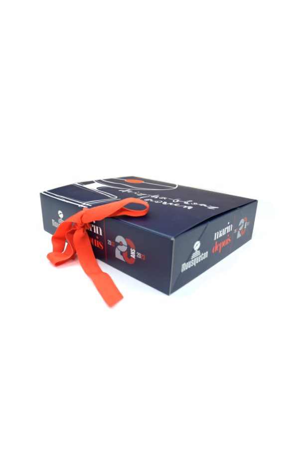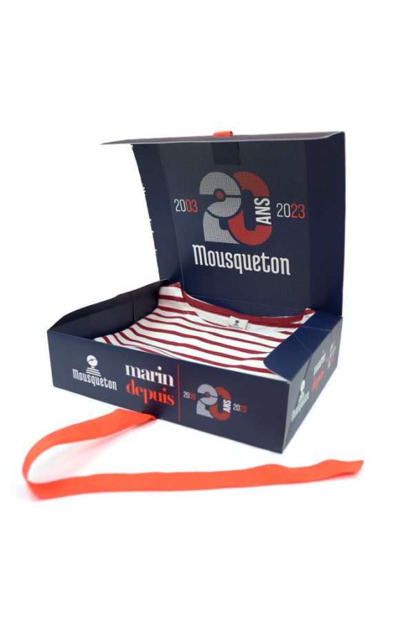 Créez un effet de surprise avec cette jolie boîte cadeau Mousqueton ! Edition spéciale des 20 ans de notre marque, cette boîte peut contenir un pull, une vareuse, une marinière … De quoi y glisser le cadeau 100% marin à vos proches.