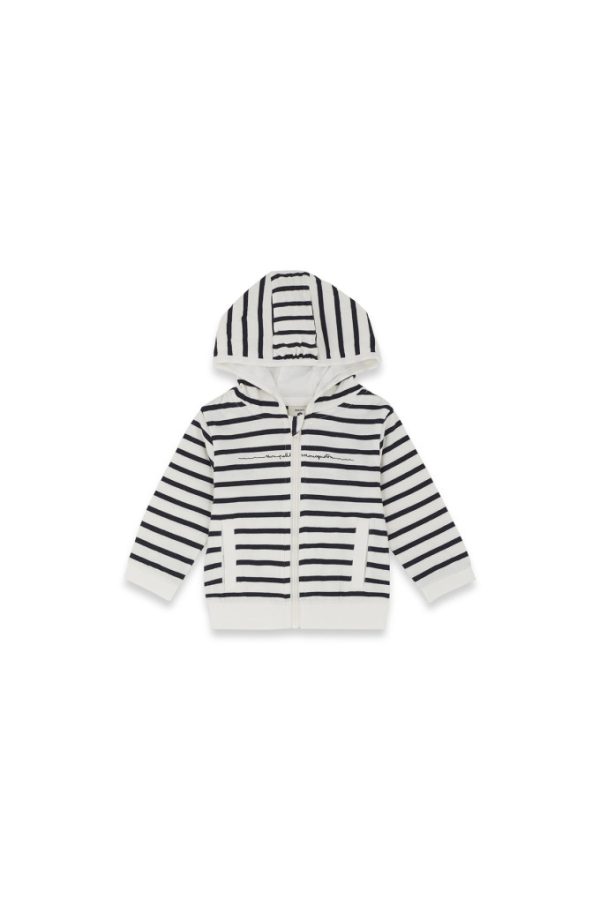 Gilet bébé rayé et zippé à capuche et en coton bio.
