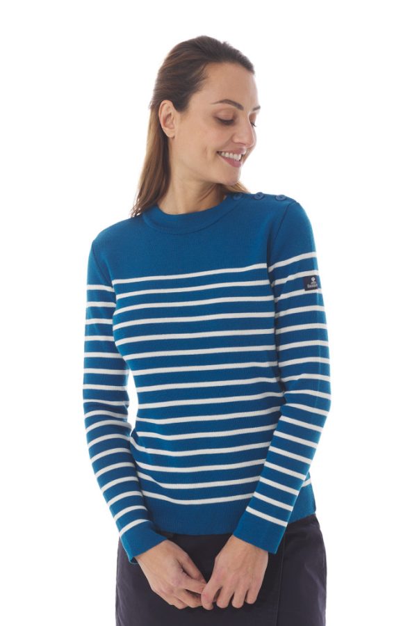 Cet incontournable pull marin vous offre confort et chaleur avec son mélange laine-acrylique. Son col rond et ses trois boutons placés sur l’épaule amplifieront le caractère marin de vos looks. Vous apprécierez sa coupe légèrement ajustée qui valorise la silhouette et donne une allure très féminine.