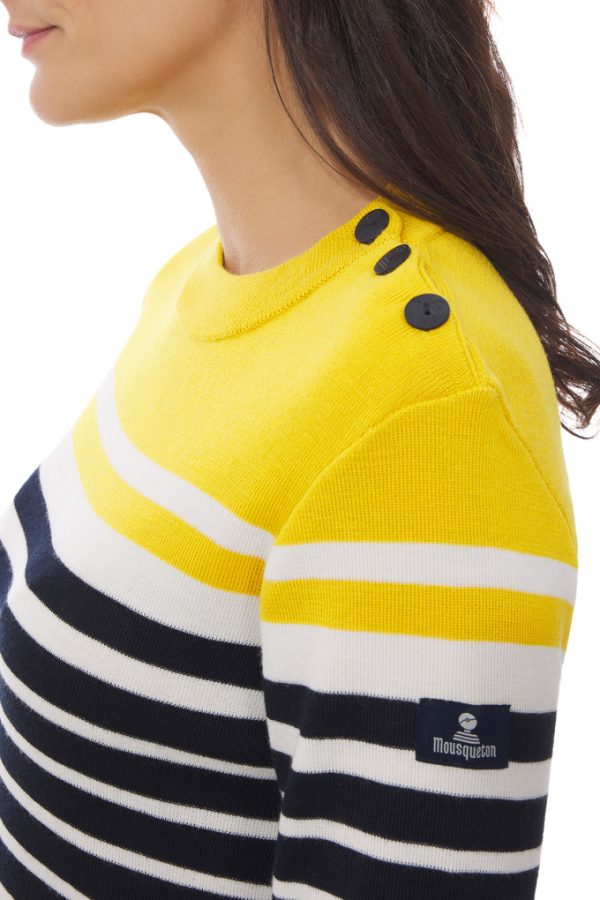 Mousqueton revisite le pull marin avec authenticité et modernité. Le modèle Morgat se décline avec ses rayures placées très originales et ses 3 couleurs. En composition laine-acrylique, cet indémodable saura vous réchauffer tout en style et en douceur.