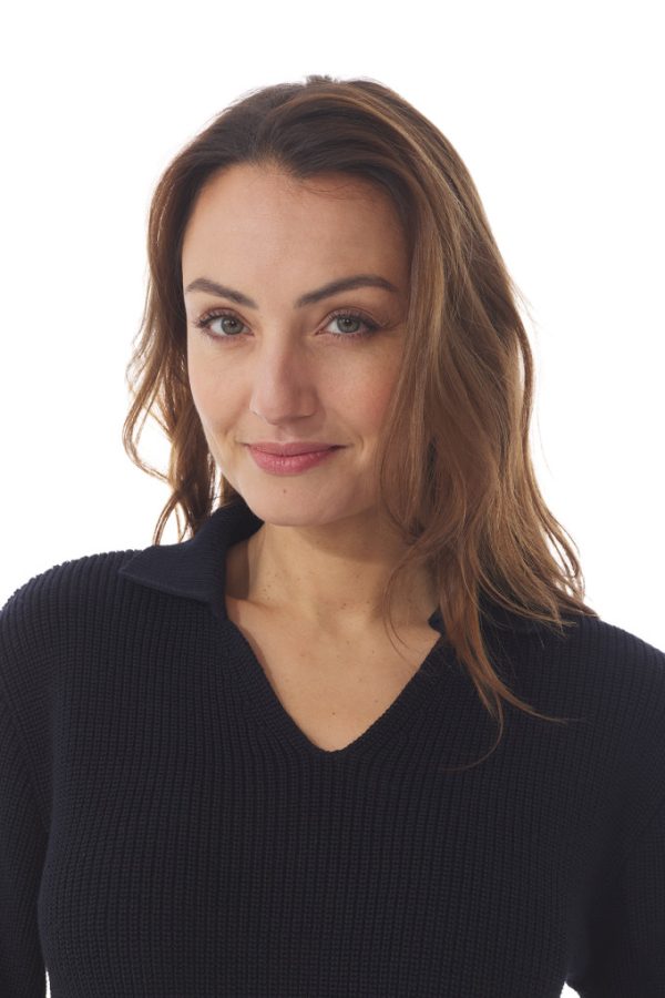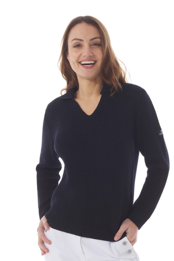 Découvrez cette nouvelle déclinaison du pull marin ! Son col en V tombant, sa coupe oversize et ses épaules basses modernisent avec féminité cette icône de la mode marine. Le tricotage en côte perlée donne à ce pull un style très authentique.