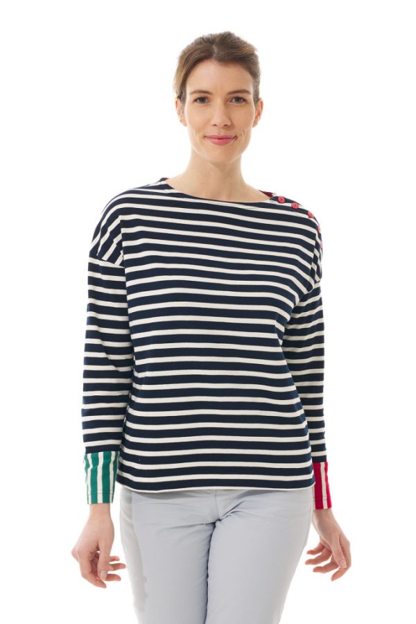 Quoi de plus original que le code couleur vert & rouge de la navigation sur les manches de cette marinière ! Vous serez une vraie fille de la mer !