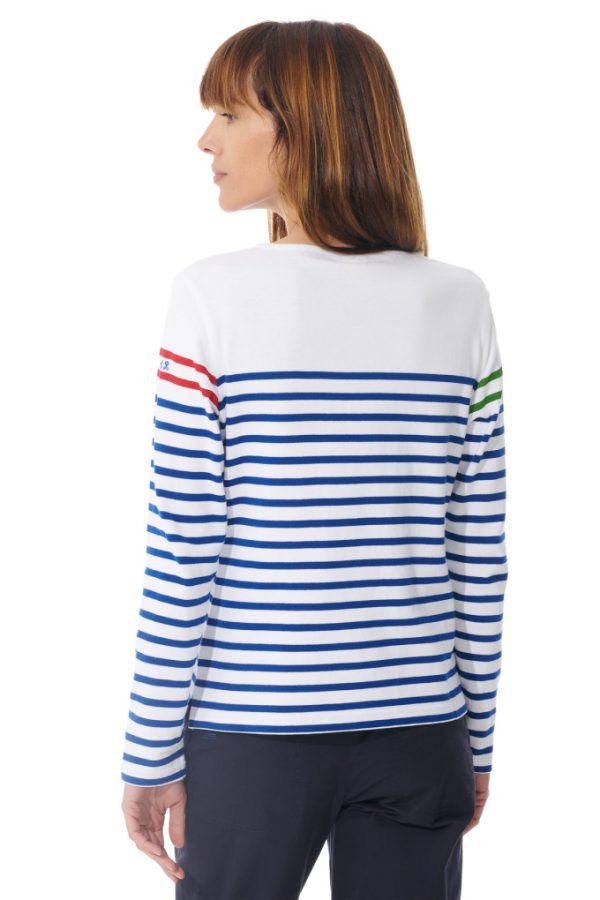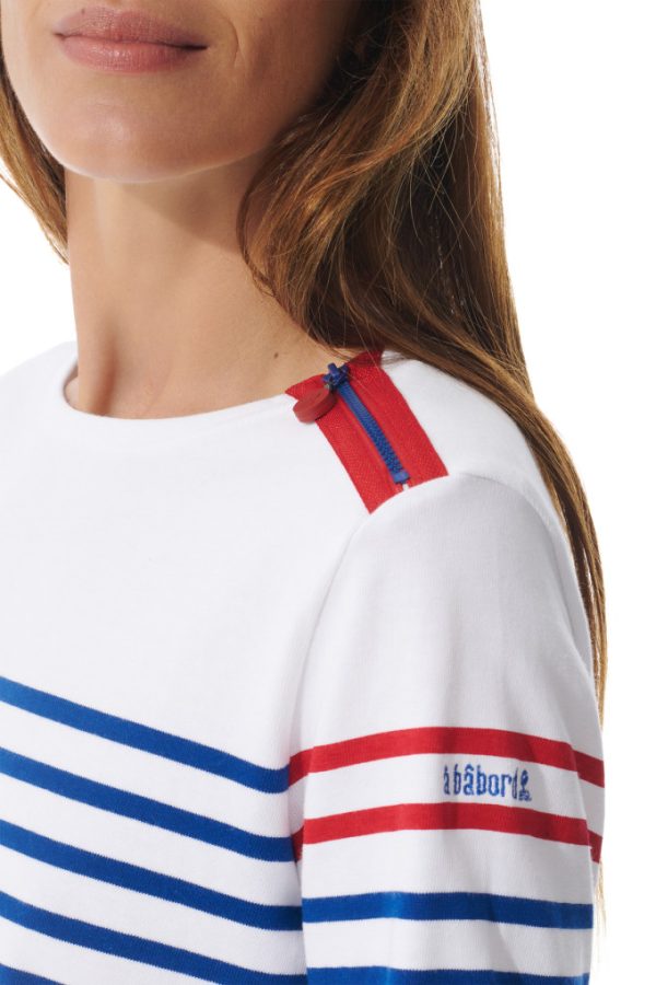 Voilà une marinière femme en jersey de coton conçue pour toutes les passionnées de la mer. « Ba » pour « bâbord » et « Tri » pour « tribord », cette création originale combine les codes de la marinière et de la navigation maritime. Nul doute que ses manches vertes et rouges vous guideront vers les îles bretonnes et le golfe du Morbihan !