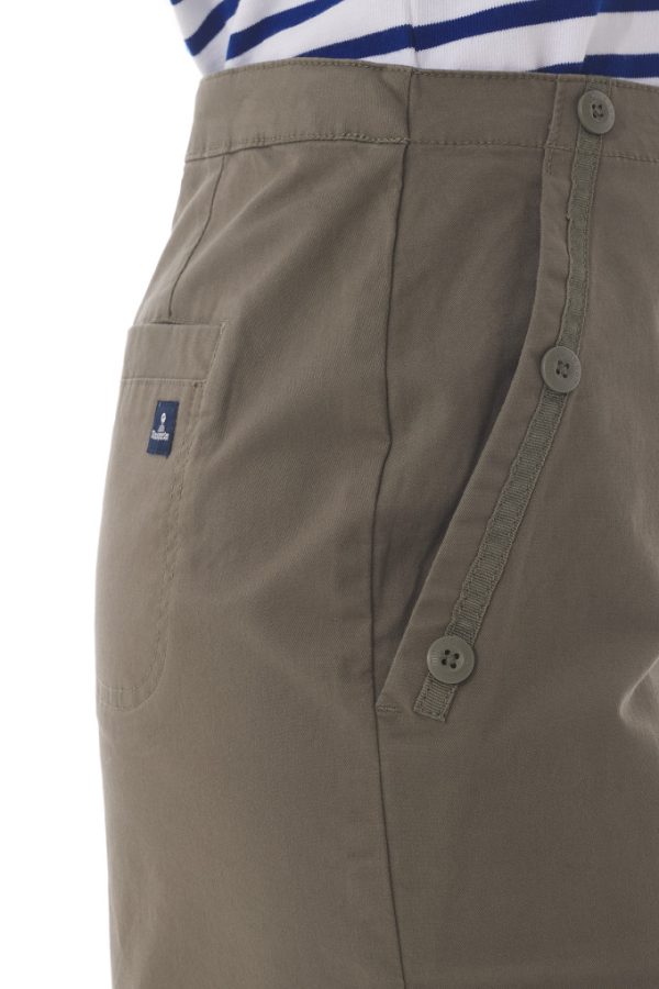 Bas arrondis. Deux poches avant soulignées de bandes en tissu boutonnées. Deux poches plaquées dos. Ceinture intérieure imprimée et ajustable par un élastique de serrage boutonné. Découpes sur l’élastique sont prévues pour passer le bouton. Zip côté gauche avec patte de confort intérieure. Logo Mousqueton sur poche droite au dos.
