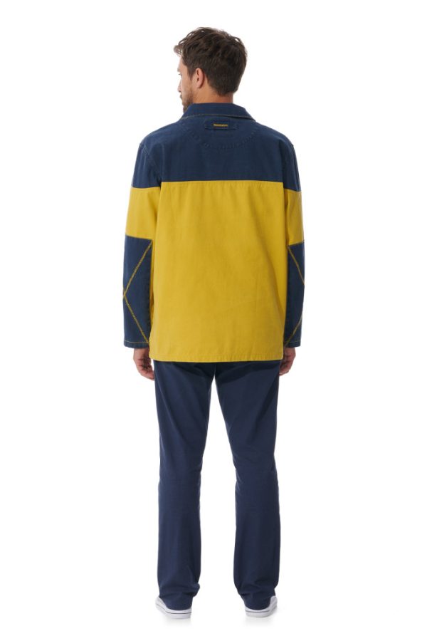 Emmanchures et coutures côtés renforcées par double sur-piquage. Fentes côtés. Coudières de couleur contrastée et décorées de surpiqûres zig zag. Poches poitrines intérieures plaquées et cousues avec coutures visibles sur l’endroit. Partie haute du corps coloris marine et partie basse de couleur contrastée.